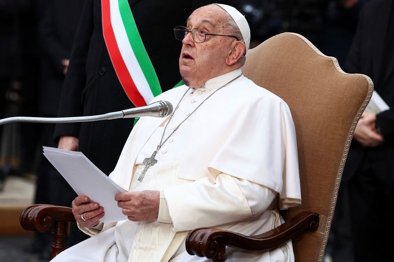 VATICAN CITY (Reuters) -Pope Francis called on Thursday for new international agreements to reduce the debt burden faced by low-income countries and a shift in spending from arms and military equipment to the eradication of global hunger.